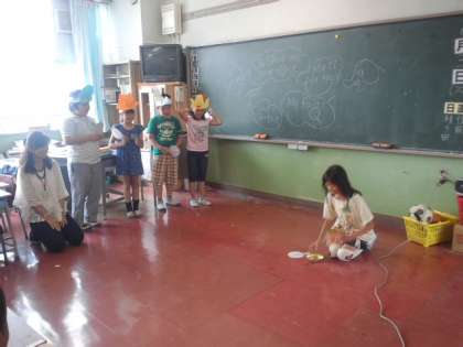 先日、羽村市英語コーディネーターの秋田先生をゲストティーチャーとしてお迎えして、外国語の授業をしていただきました。4年生5年生6年生に教えてくださいました。英語劇を取り入れてながら子どもたちは楽しみながら英語を学んでいました。