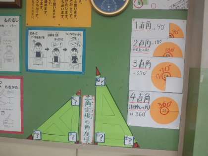 算数教室の教室と廊下に貼ってある掲示物です。今、どの学年がどんな学習を勉強しているのかわかるようになっています。