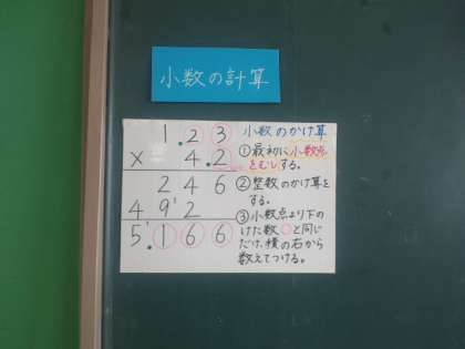 算数教室の教室と廊下に貼ってある掲示物です。今、どの学年がどんな学習を勉強しているのかわかるようになっています。