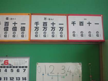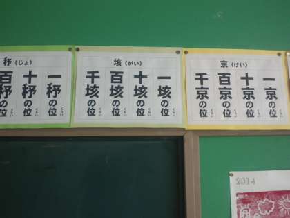 算数教室の教室と廊下に貼ってある掲示物です。今、どの学年がどんな学習を勉強しているのかわかるようになっています。