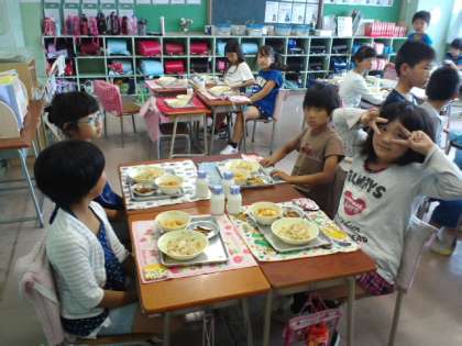 今日は3年生と一緒に給食を食べました。