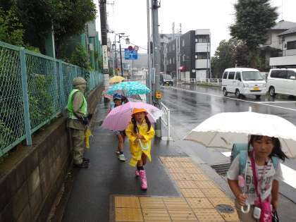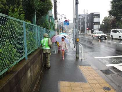昨日はあいにくの雨模様。雨でも安全ボランティアの方が合羽を着て子供たちの登校の見守りをしてくれます。本当にありがたいです。