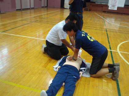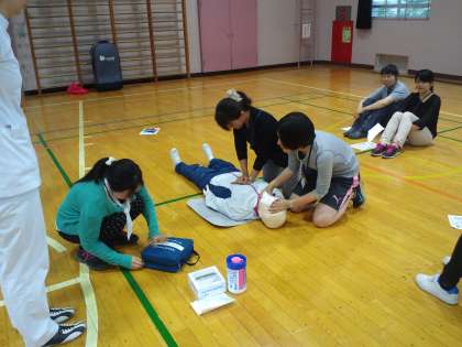先日第九小学校の先生方と本校の先生方が一緒に救急法の講習を受けました。今年は、第九小学校の体育館で行いました。