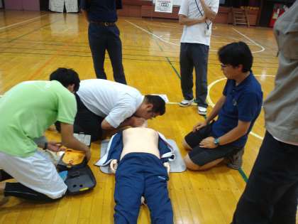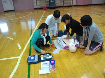 先日第九小学校の先生方と本校の先生方が一緒に救急法の講習を受けました。今年は、第九小学校の体育館で行いました。