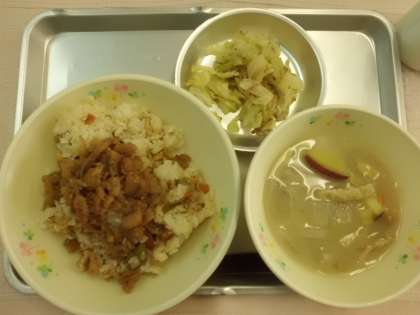 キャベツの生姜風味はゆでたキャベツを生姜汁、糸けずり節、みりん、醤油、塩で和えました。見ためで食べたくないと言っていた子が、「これ、すごくおいしい」と言っておかわりまでしていました。