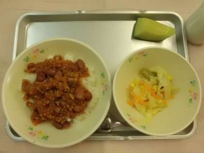 金時豆がたっぷり入ったチリコンカンライスでしたが、豆嫌いな子でも食べやすそうで、どのクラスもほとんど残食なく、よく食べていました。