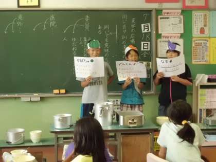 今日は保健給食委員会の子供たちが夏野菜カレーやじゃこサラダに入っている野菜の栄養の話をしながら、各クラスを回ってくれました。