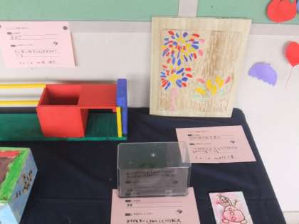 先週から始まった夏休みの作品展、残すところ、あと、二日間になりました。子供たちが頑張った作品や自由研究をご覧ください。紹介します。