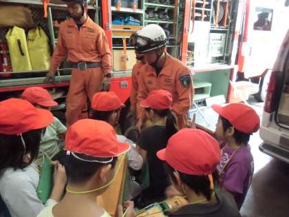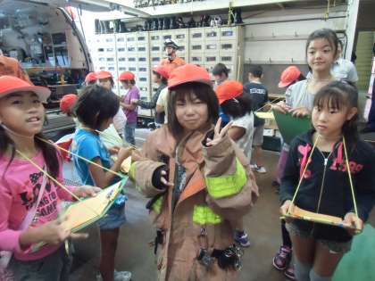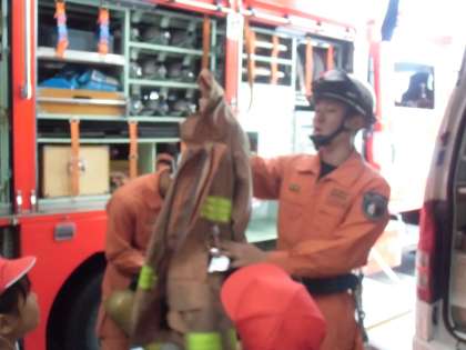 防火衣の見せてくれました。すすがついていて、重くて臨場感にあふれていました。