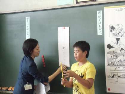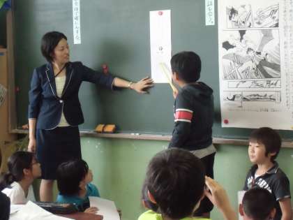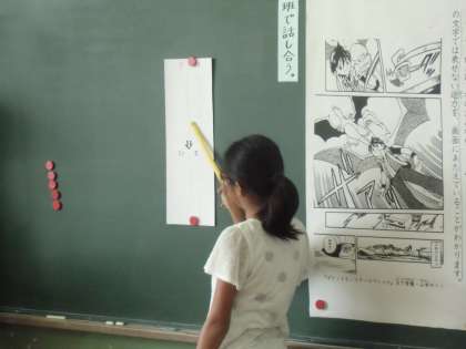 グループでまとめた短冊を黒板に掲示し、みんなの前で発表します。