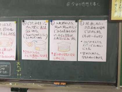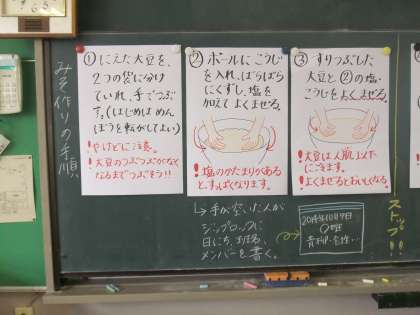 5年生が味噌作りを家庭科室で行っていました。おいしいお味噌ができるといいね。