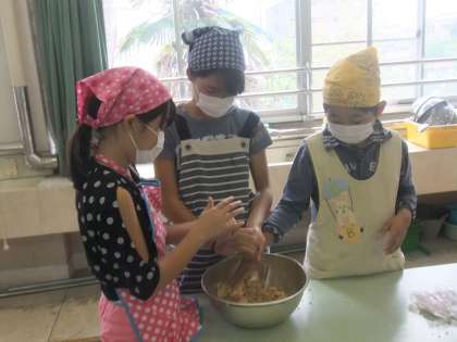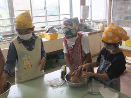 5年生が味噌作りを家庭科室で行っていました。おいしいお味噌ができるといいね。