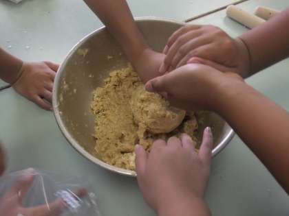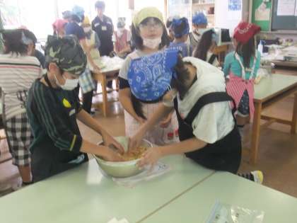 5年生が味噌作りを家庭科室で行っていました。おいしいお味噌ができるといいね。