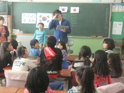 10月24日金曜日に創価大学に留学に来ている6名の方々が来てくださいました、その日は、韓国、セネガル、アメリカ、トルコ、シンガポールから日本に留学に来ている方々です。日本語が上手でびっくりしました。子供たちは大興奮ですごく楽しそうでした。3時間目は体育館で全体会を行いました。その後、4校時から給食までは、各クラスに分かれ、さらに交流を深めました。留学生の皆さん、ありがとうございました。