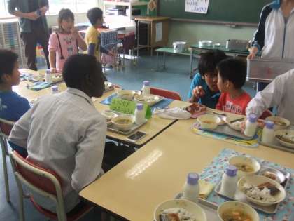 10月24日金曜日に創価大学に留学に来ている6名の方々が来てくださいました、その日は、韓国、セネガル、アメリカ、トルコ、シンガポールから日本に留学に来ている方々です。日本語が上手でびっくりしました。子供たちは大興奮ですごく楽しそうでした。3時間目は体育館で全体会を行いました。その後、4校時から給食までは、各クラスに分かれ、さらに交流を深めました。留学生の皆さん、ありがとうございました。