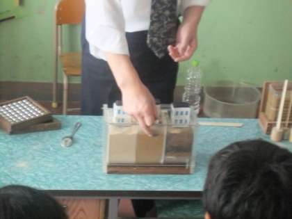 先週の金曜日に6年生の理科「土地のつくりとはたらき」の単元で、防衛大学校の正垣先生をゲストティーチャーとしてお招きして授業を行いました。先生は地盤工学の専門家ですので、子供たちには、「土の分類と性質」「地形と地層」「地盤による災害のおき方(地すべり、地震、土石流、液状化現象」と「どう対処したらよいか」まで教えていただきました。その時の様子です。