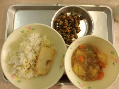 雑穀ごはんには押麦ときびが入っていました。前回のきびごはんよりも食べやすかったようで、よく食べてくれました。