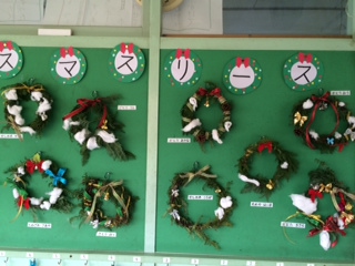 1年生の廊下の掲示です。国語「はたらく自動車」で、学習したことを書いたものと、クリスマスリースが掲示されていました。