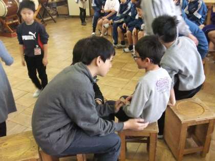 今日、あさひ学級の子供たちが楢原中学校に行き、交流をしてきました。楢原中学校の5組さんの太鼓の演奏は本当に見事でした。感動しました。そして、そのあと、ゲームをしながら交流活動をして、お礼にあさひの子供たちは「オーラリー」をハンドベルで演奏しました。そして、最後に楢原中学校の先生に太鼓を教えていただきました。
