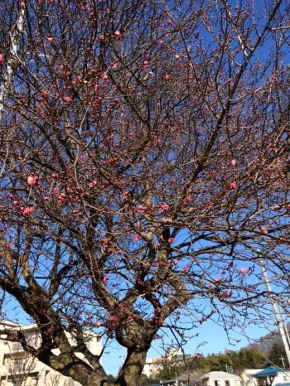 学校では、紅梅の花が咲き始めました。