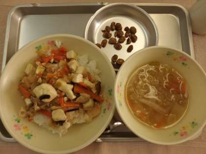 豆腐のうま煮丼の椎茸と豆黒糖で苦戦している子が見受けられましたが、全体的にはほとんど残食なく、よく食べてくれていました。