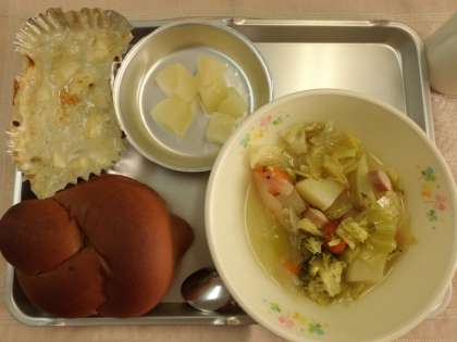 和風豆腐グラタンには豆腐、鶏肉、玉ねぎ、マッシュルーム、しめじ、にんにく等の具材が入っていましたが、きのこが苦手な子も食べやすかったようで、ほじくって食缶に戻す子はいませんでした。