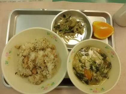 きのこと卵のスープは鶏肉、人参、たけのこ、しめじ、えのきたけ、きくらげ、長ねぎ、小松菜、卵など具だくさんのスープだったので、きのこ類が苦手な子も食べやすかったようです。