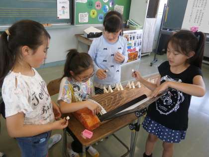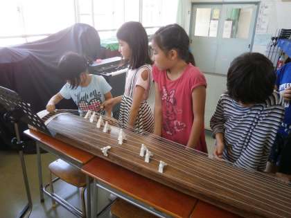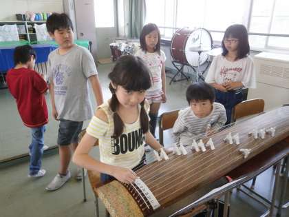 今日は箏の体験をしました。初めて触る箏に子供たちは興味津々な様子。きれいな音を出すのはけっこう難しいのですが、「さくらさくら」に挑戦しました。爪をつけて弦をはじく、簡単そうに見えて意外に難しい箏でしたが、子供たちは楽しそうに活動していました。