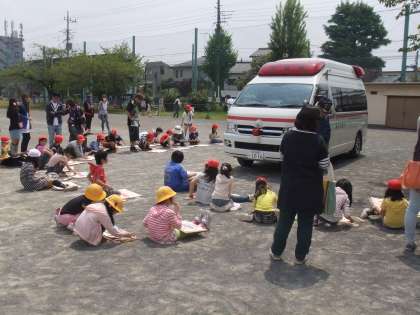 遅くなりましたが、4月25日土曜日の学校公開日の授業の様子を紹介します。 1〜3年生の消防車写生会今年は救急車の写生会になりました。