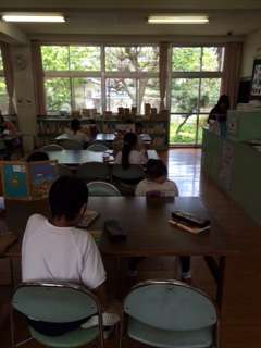 学校図書館で、静かに本を読んでいました。