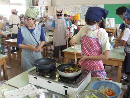先週の金曜日、6年生が家庭科で調理実習を行いました。野菜炒めといり卵、スクランブルエッグでした。さすが6年生、とても上手においしく出来上がりました。