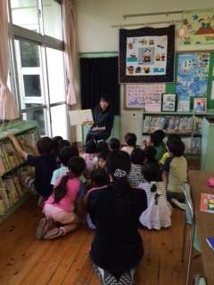 今日、木曜日は、学校司書の先生が本校にいらっしゃる日です。1年生が学校司書の先生に読み聞かせをしていただいた時の写真です。