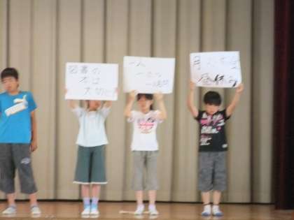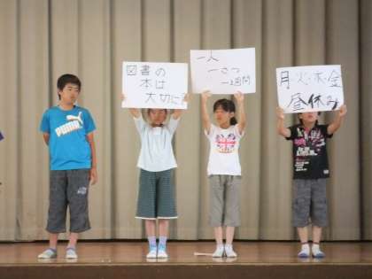 先週の木曜日、委員会紹介集会がありました。今回は代表委員会、環境整備委員会、図書委員会の3つの紹介でした。