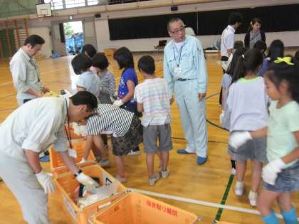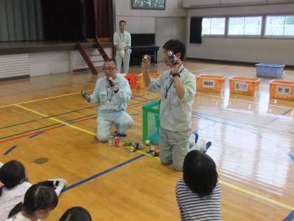 先日、戸吹清掃工場の方々をお招きして、4年生がごみの学習をしました。初めにごみ処理の場所、方法、そして3Rについてなど学び、そのあと、ごみ収集車へのごみの投入の体験、そして、ごみの分別体験を行いました。