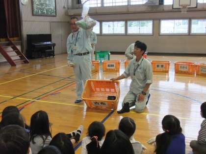 先日、戸吹清掃工場の方々をお招きして、4年生がごみの学習をしました。初めにごみ処理の場所、方法、そして3Rについてなど学び、そのあと、ごみ収集車へのごみの投入の体験、そして、ごみの分別体験を行いました。