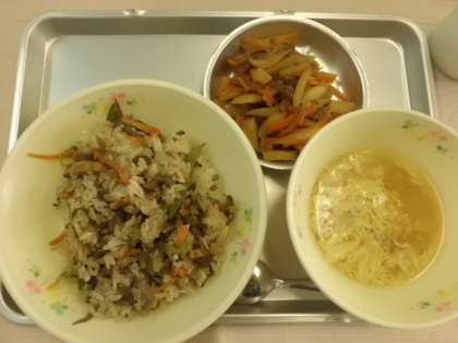 とりごぼうごはんは鶏肉・ごぼう・油揚げ・人参・さやえんどうを炒めて、砂糖・醤油・酒で味つけをし、ごはんに混ぜ込みました。1年生はジャンボおにぎりをおかわりしている子がいました。全部食べられたかな?
