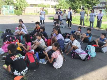今日、5年生が静岡県の清水市へ移動教室に行きました。みんな元気に出発しました。今日は、お茶摘み体験、工場見学、地引網、三保の松原の見学などをしています。詳しくは、帰ってきてからホームページで紹介します。