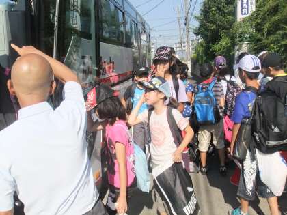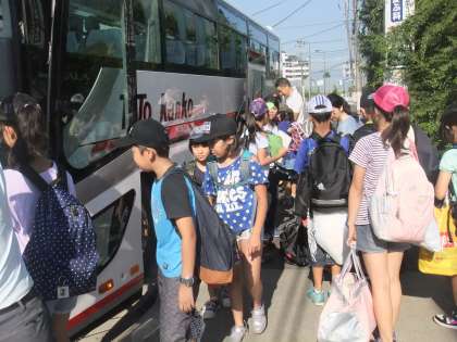 今日、5年生が静岡県の清水市へ移動教室に行きました。みんな元気に出発しました。今日は、お茶摘み体験、工場見学、地引網、三保の松原の見学などをしています。詳しくは、帰ってきてからホームページで紹介します。