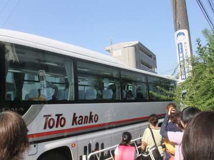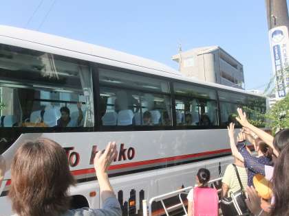 今日、5年生が静岡県の清水市へ移動教室に行きました。みんな元気に出発しました。今日は、お茶摘み体験、工場見学、地引網、三保の松原の見学などをしています。詳しくは、帰ってきてからホームページで紹介します。
