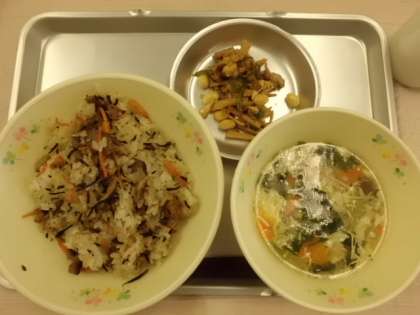 今学期最後の給食は汗で流れやすいミネラルを摂取できるように、ひじきごはんです。