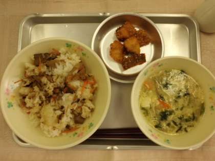 ほきのごま味噌がらめは角切りのほきに酒・醤油・生姜で下味をつけ、片栗粉をつけて油で揚げます。赤みそとケチャップ、醤油、砂糖を煮たてて作ったタレにをからめ、ごまをからめれば完成です。甘辛いタレが子供たちに人気で、ほとんど残食はありませんでした。