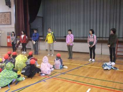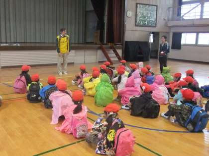 体育館で出発式をして、元気に出発しました。