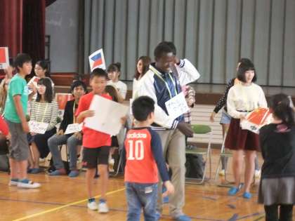 本校では創価大学の留学生をお迎えして、今年度も国際理解教育を行いました。3時間目は体育館で全体会を行いました。本校の校歌を聞いてもらい、そのあと、留学生の方々から自己紹介をしてもらいました。次に、みんなで歌おうということで歌を1曲歌い、そのあと全員でじゃんけん列車をしました。
