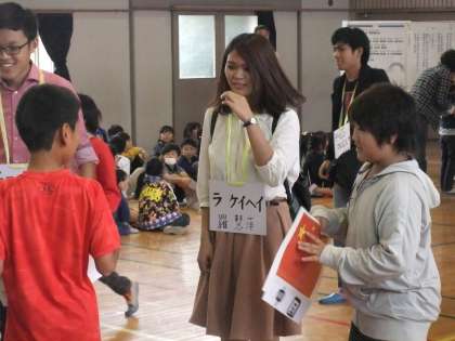 本校では創価大学の留学生をお迎えして、今年度も国際理解教育を行いました。3時間目は体育館で全体会を行いました。本校の校歌を聞いてもらい、そのあと、留学生の方々から自己紹介をしてもらいました。次に、みんなで歌おうということで歌を1曲歌い、そのあと全員でじゃんけん列車をしました。