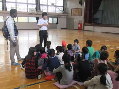 本校では創価大学の留学生をお迎えして、今年度も国際理解教育を行いました。3時間目は体育館で全体会を行いました。本校の校歌を聞いてもらい、そのあと、留学生の方々から自己紹介をしてもらいました。次に、みんなで歌おうということで歌を1曲歌い、そのあと全員でじゃんけん列車をしました。