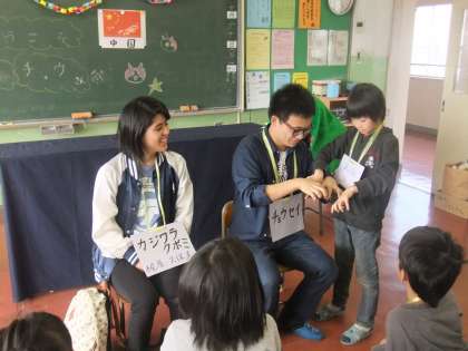 本校では創価大学の留学生をお迎えして、今年度も国際理解教育を行いました。3時間目は体育館で全体会を行いました。本校の校歌を聞いてもらい、そのあと、留学生の方々から自己紹介をしてもらいました。次に、みんなで歌おうということで歌を1曲歌い、そのあと全員でじゃんけん列車をしました。