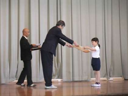 1学期に行った消防写生会で優秀賞と入選になった子供たちの賞状と賞品が学校に届きましたので、今日の全校朝会で表彰しました。
