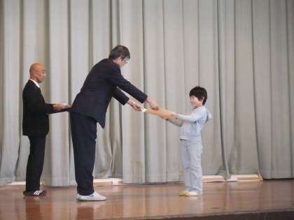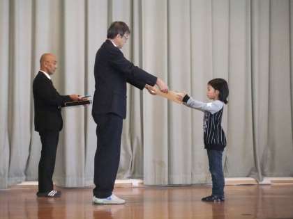 1学期に行った消防写生会で優秀賞と入選になった子供たちの賞状と賞品が学校に届きましたので、今日の全校朝会で表彰しました。