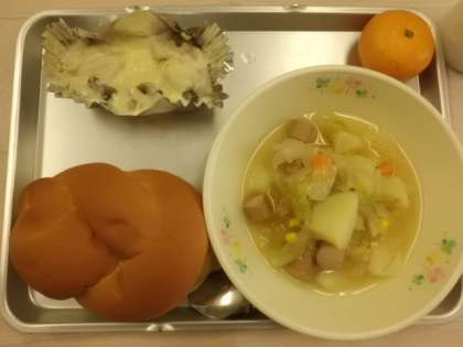 秋野菜のグラタンには里芋とれんこんがたっぷり入っていました。その他にも鶏肉、ベーコン、玉ねぎ、しめじ、ブロッコリーなど具沢山で、子供たちもよく食べていました。