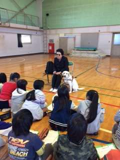今、4年生は、総合的な学習の時間に福祉の学習をしています。先週は、3つの体験活動をしました。三つ目は、盲導犬と一緒に暮らしている方のお話を聞きました。